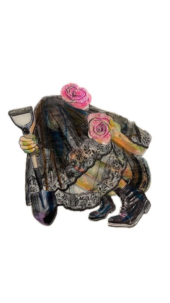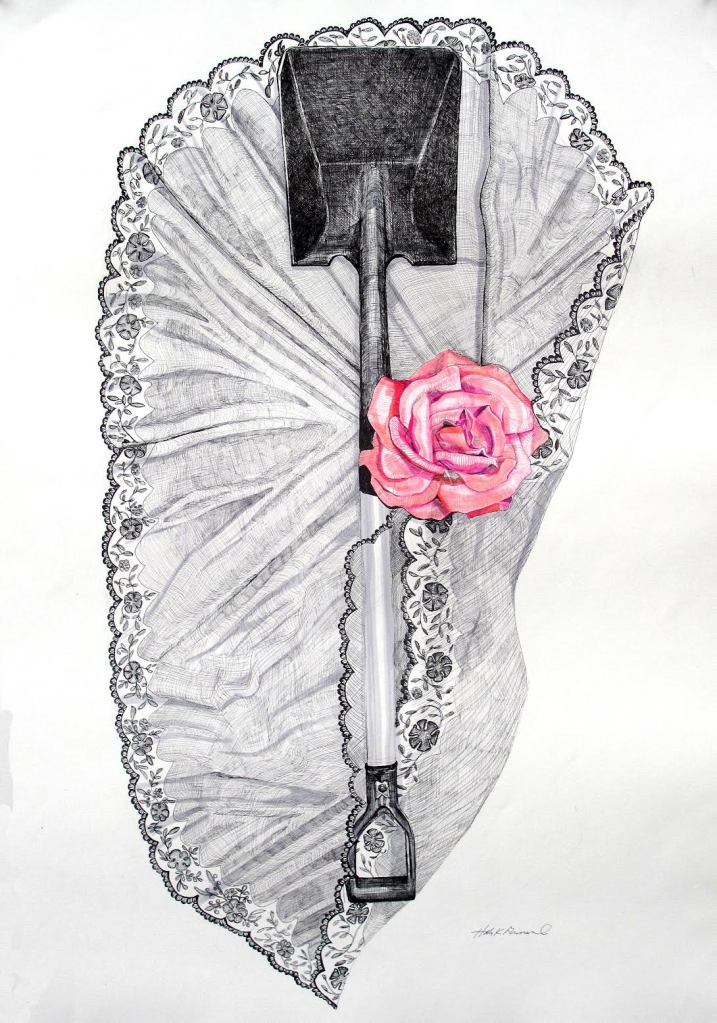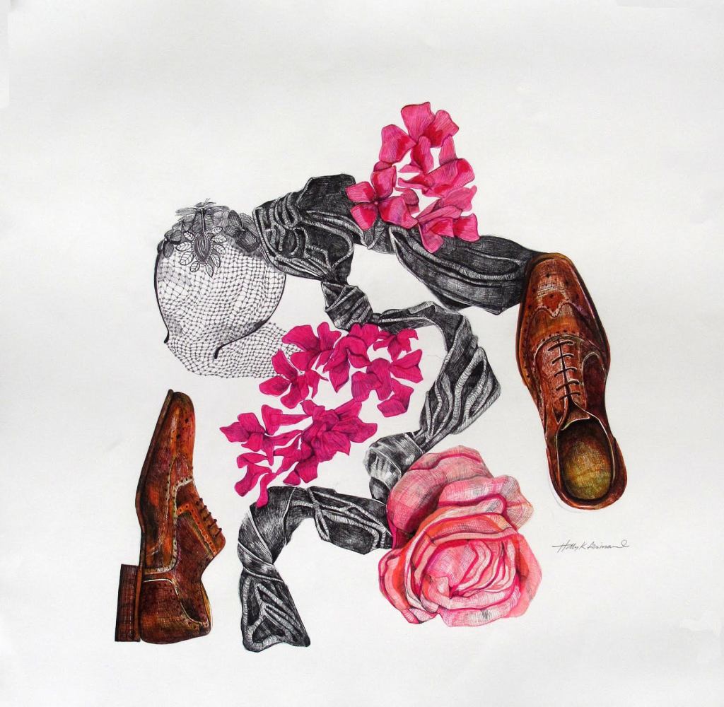 I started using veils, flowers, scarves, and articles of clothing to construct my compositions, this time, the frames less templated and more organic. At this time, I had the boundary of the drawing to work with, staying within the confines of a piece of paper, or at times, creeping off the edges of a cradled panel. Making these, I’m thinking about patterns and boundaries within relationships – the potential we have to nurture good relationships, how toxic patterns weave many relationships and the significance of mourning those who are still living, but who may need to be left behind. The use of ink felt very straightforward, sharp, and controlled; the perfect metaphor for certainty in boundary-setting, an area of life that can at times can feel fuzzy and unclear.