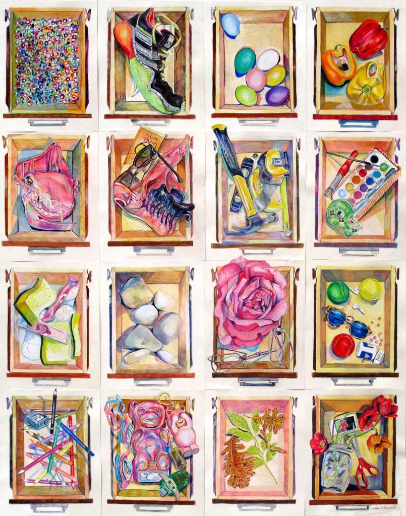 I began drawing objects from life during the pandemic. When most of life was experienced through screens. When this work began, I remember how alive I felt engaging with objects in this way, arranging, lighting and confronting them with paper, pens and pencils. Over time, my additive way of drawing and working with mixed media became repetitious and therapeutic in a way that reminded me of dribbling or shooting a ball, running and other activities I have known to bring me to states of flow. I created 32 drawer drawings in my sketchbook in the course of one year.