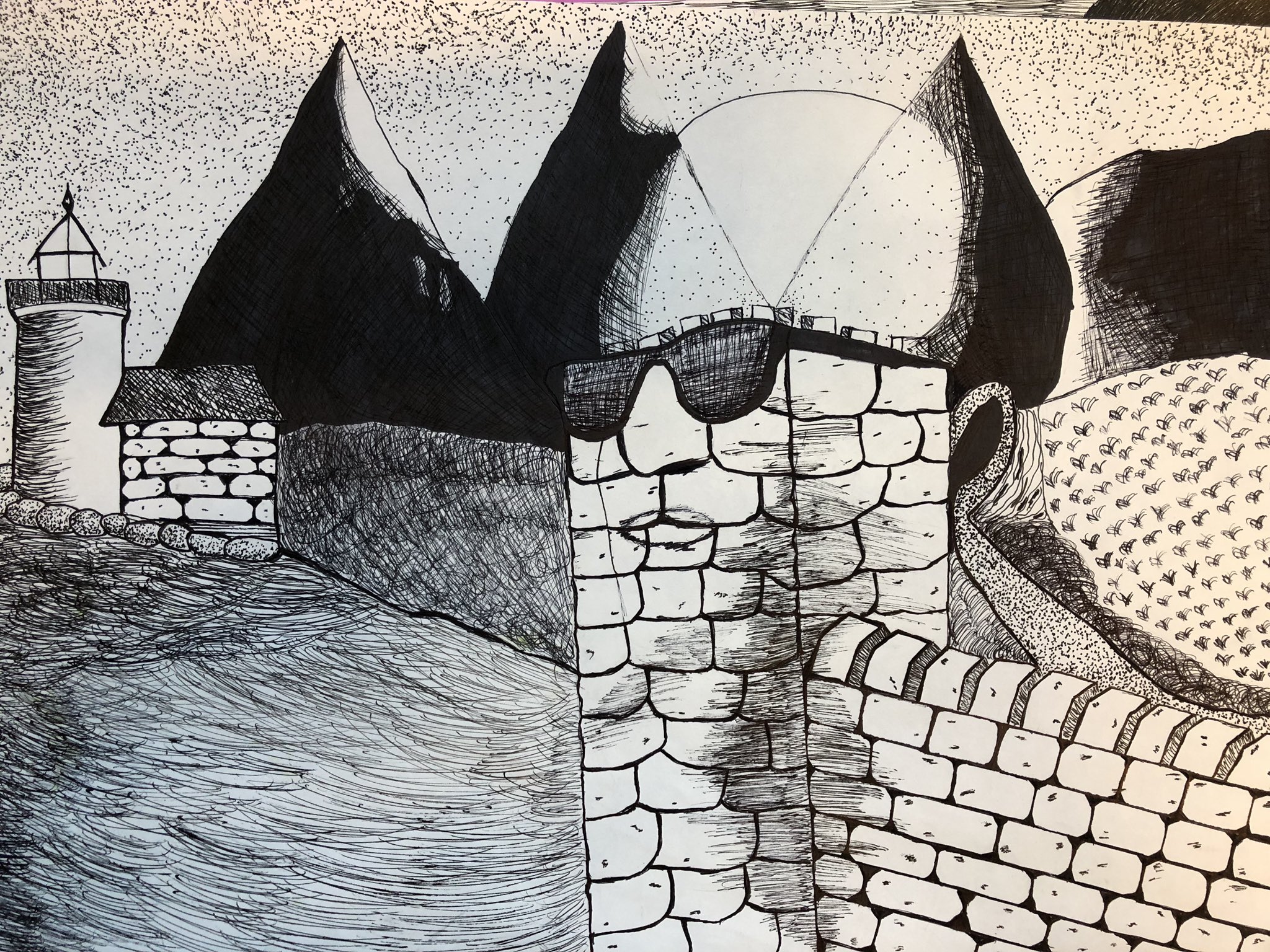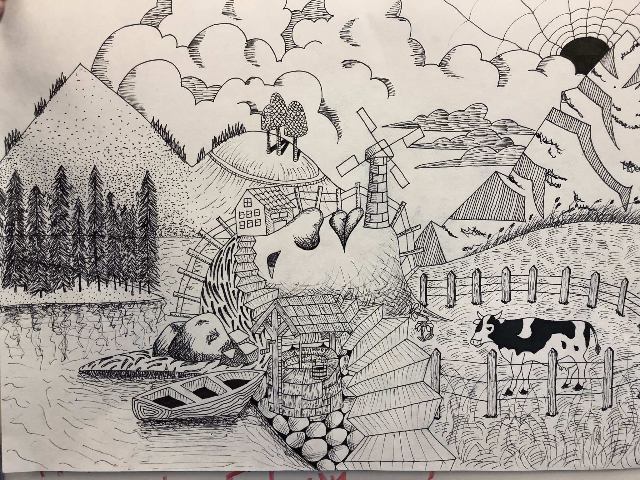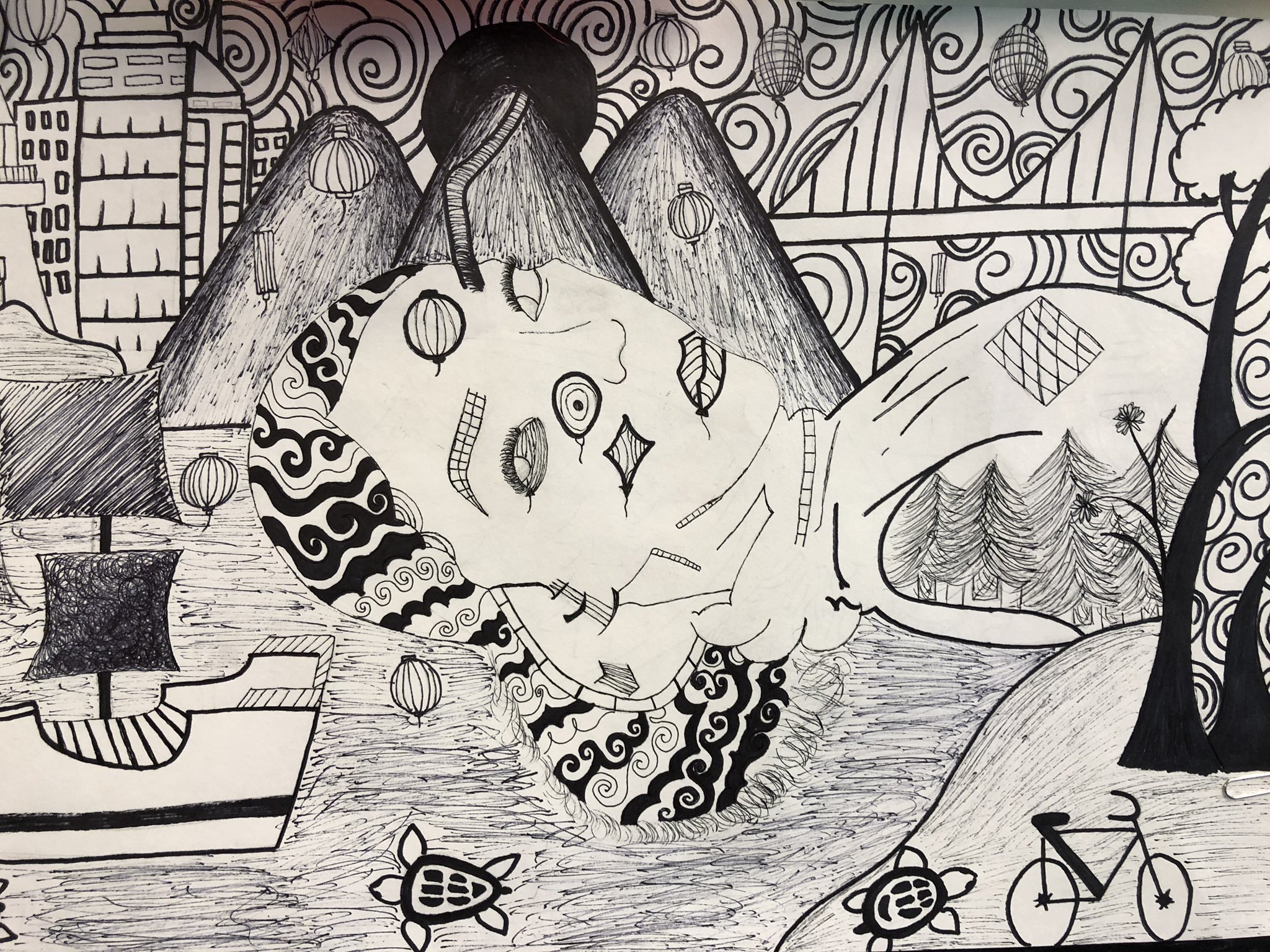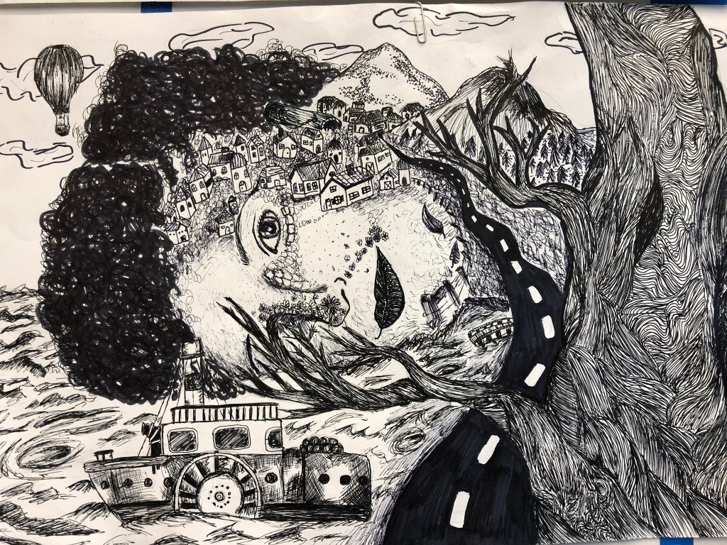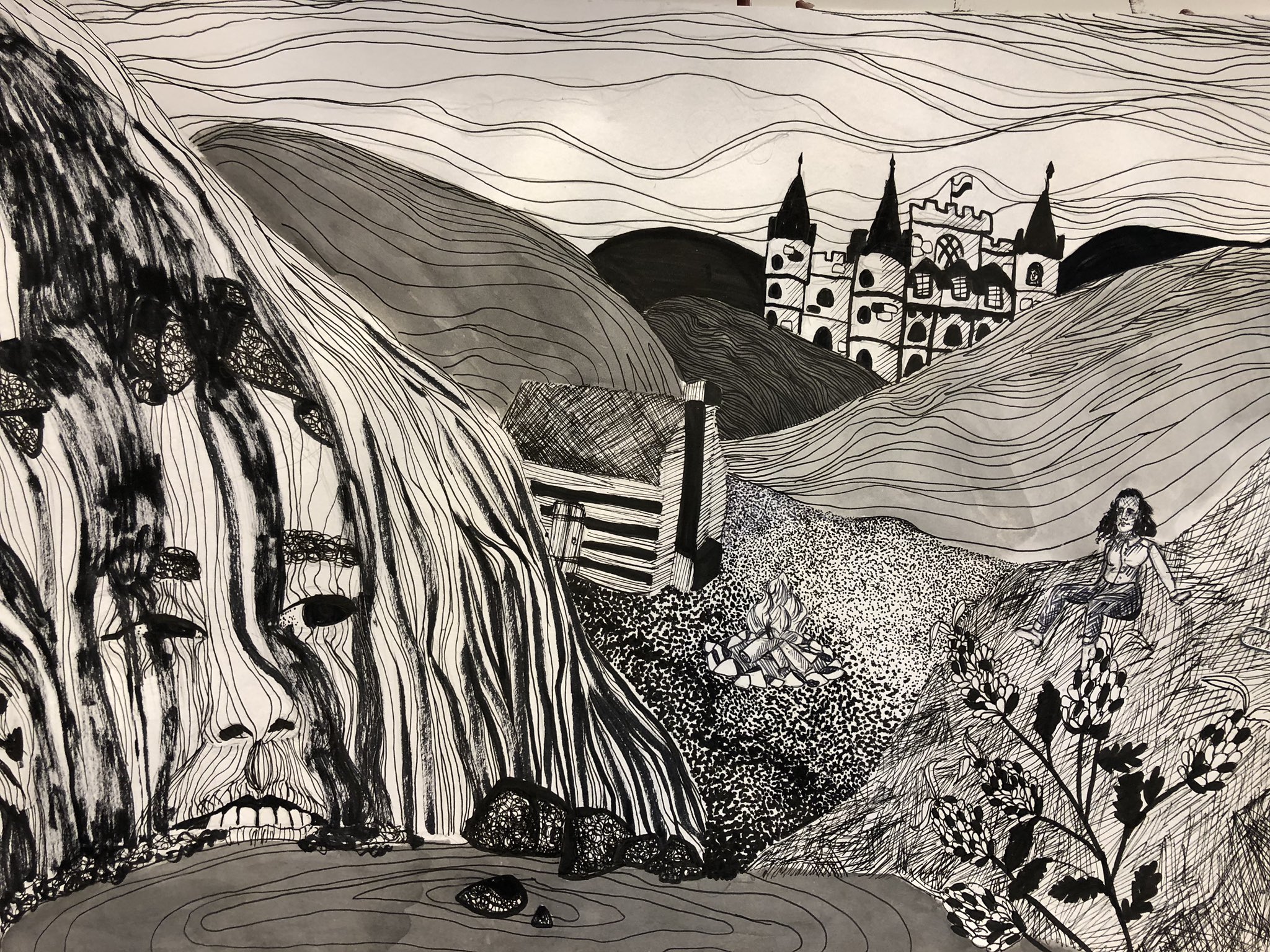 Students looked at examples of anthropomorphic landscapes from the 1500s, and modernized them by choosing one of TIME Magazine’s Most Influential People of 2018. They were tasked to utilized a variety of techniques, show a range of value and juxtapose the portrait into the imaginative landscape of choice.