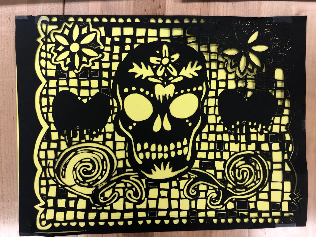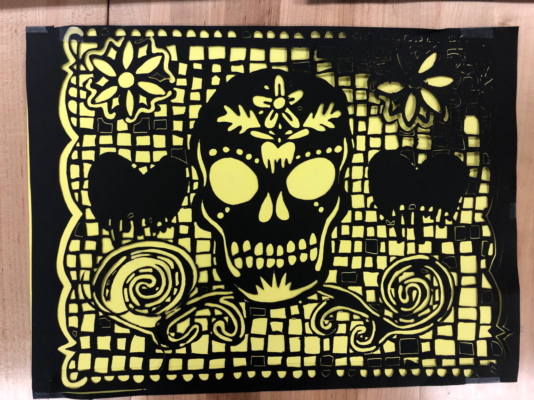 Students utilize technology to work in the style of the old Mexican craft of Papel picado. After learning the history of the art form, students drew a symmetrical plan in their sketchbook. After making necessary revisions, they scanned and converted their drawings to Corel Draw and observed the laser cutter removing their negative spaces and lattice work.