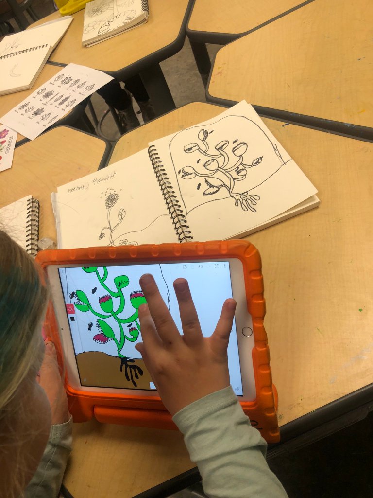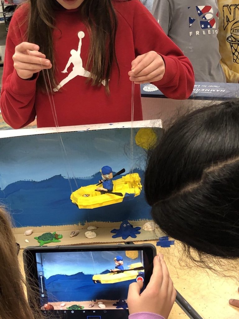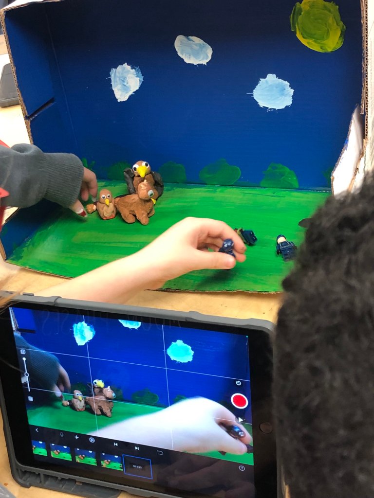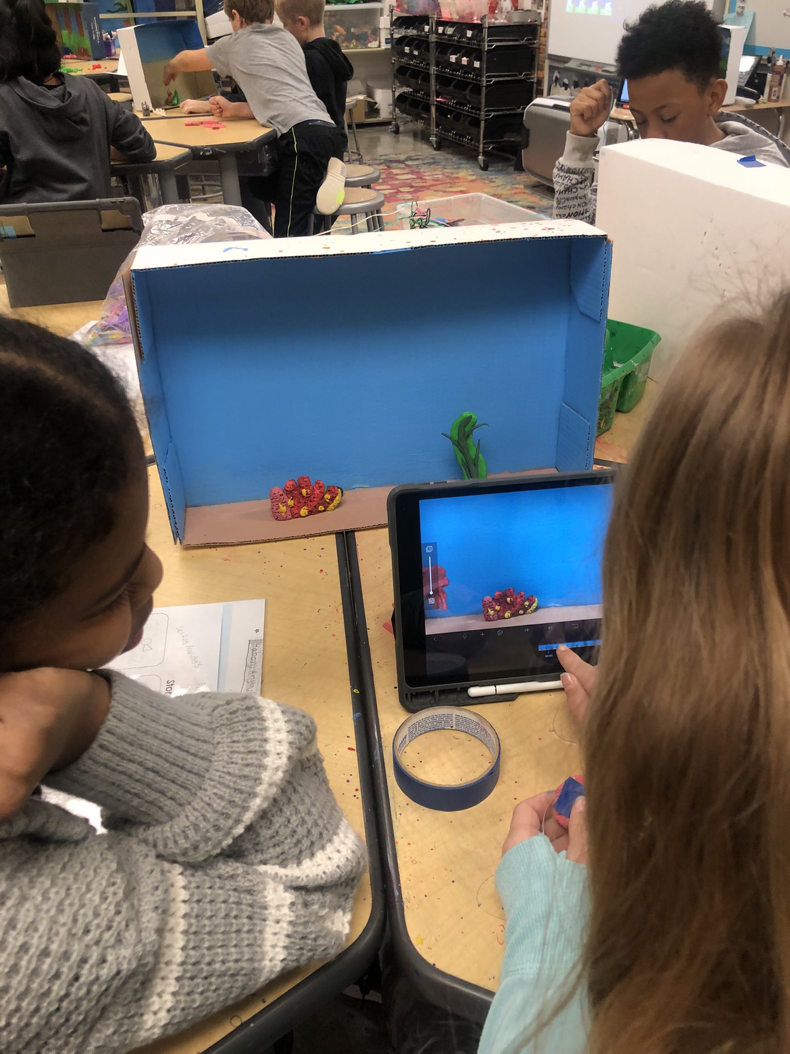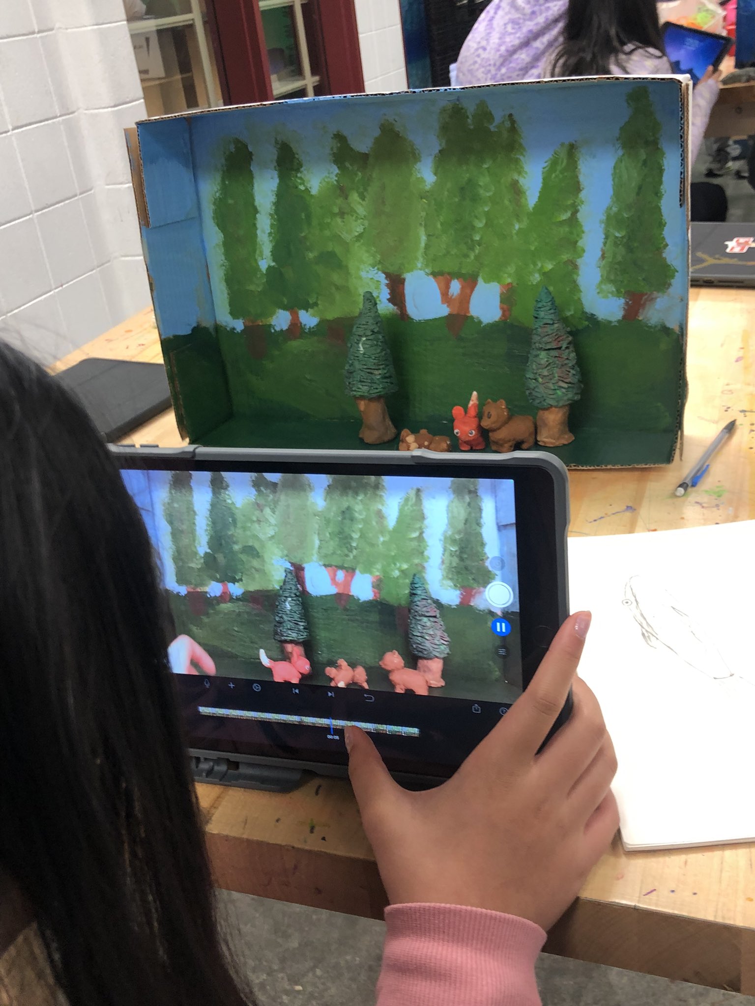 Students study a specific biome in science. Working in groups, they each selected a particular creature from their biome to star in an original story. Students conceived of a story and wrote it out in storyboards. Together, they built props and created claymation animals, they designed sets and animated their story in the Stop Motion. In the editing stages, students moved their work into iMovie, created titles, adjusted pacing, applied filters when applicable and inserted VoiceOver to tell the story that had been rewritten from the beginning stages. Through this animation workflow, students are teammates, sculptors, painters, storytellers, problem-solvers, voice-actors and writers.